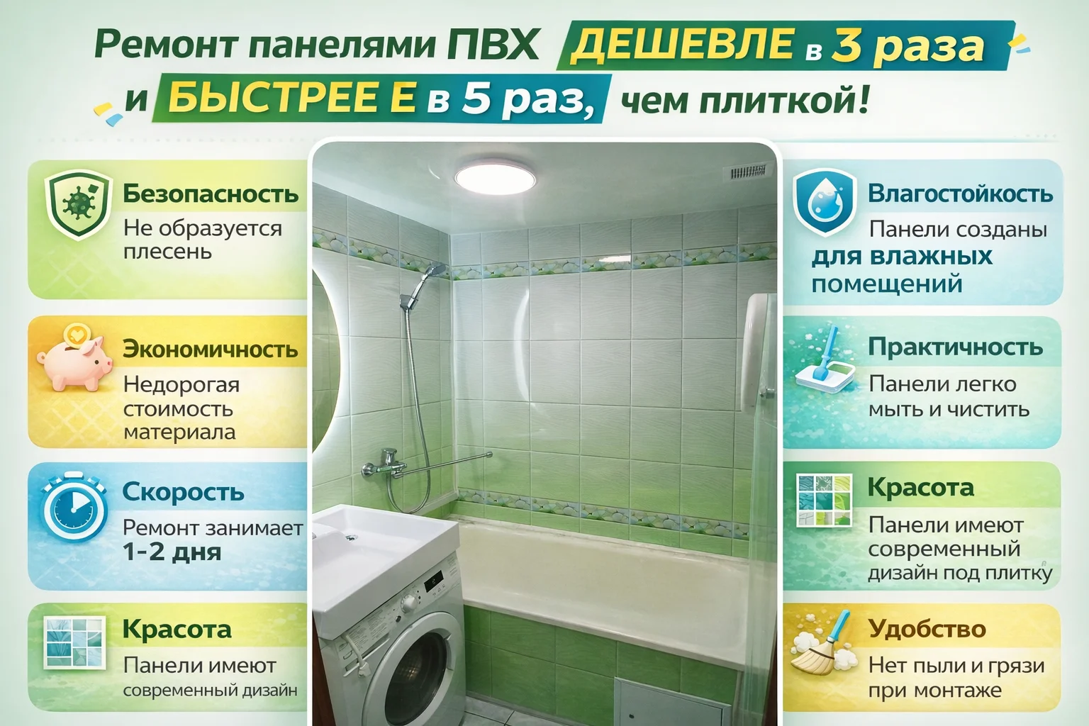 Ремонт ванной панелями ПВХ дешевле в 3 раза и быстрее в 5 раз, чем плиткой!
